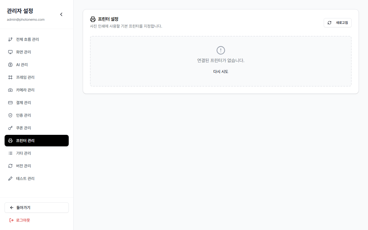 키오스크에 연결된 프린터가 없으면 "연결된 프린터가 없습니다."라는 안내 메시지와 함께 다시 시도 링크가 표시됩니다.