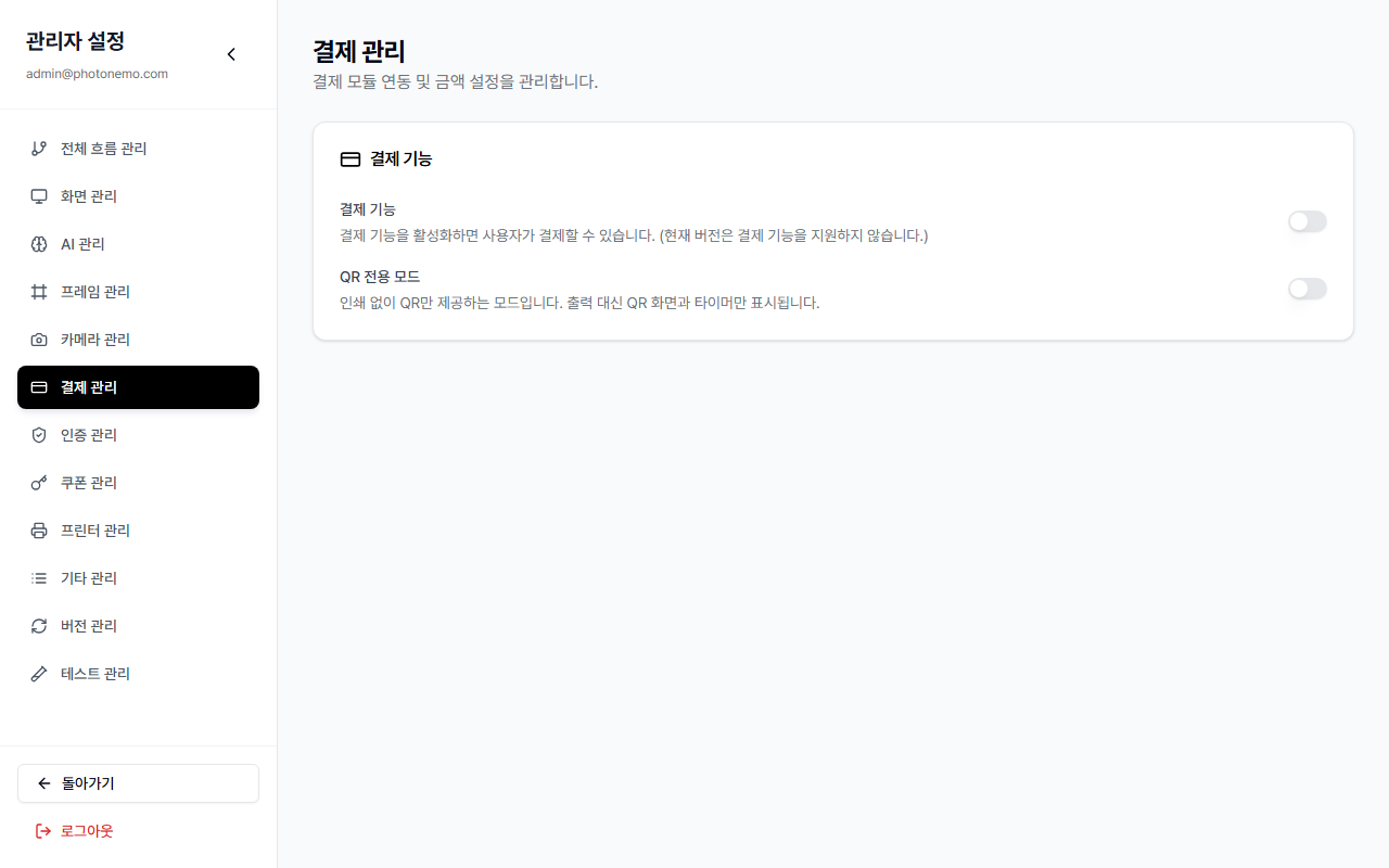 결제 기능의 활성화 여부를 설정하는 토글입니다. 활성화하면 키오스크에서 사용자가 결제를 진행할 수 있습니다. 현재 버전에서는 결제 기능을 지원하지 않으며, 토글을 켜려고 하면 "현재 버전은 결제 기능을 지원하지 않습니다."라는 안내 메시지가 표시됩니다.