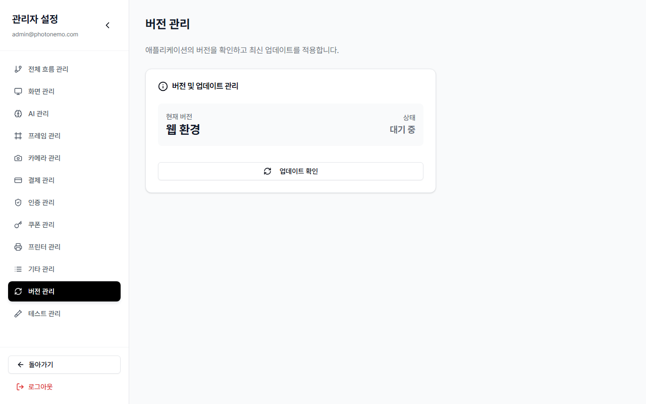 앱 버전 정보와 업데이트 기능이 하나의 카드 안에 구성되어 있습니다.