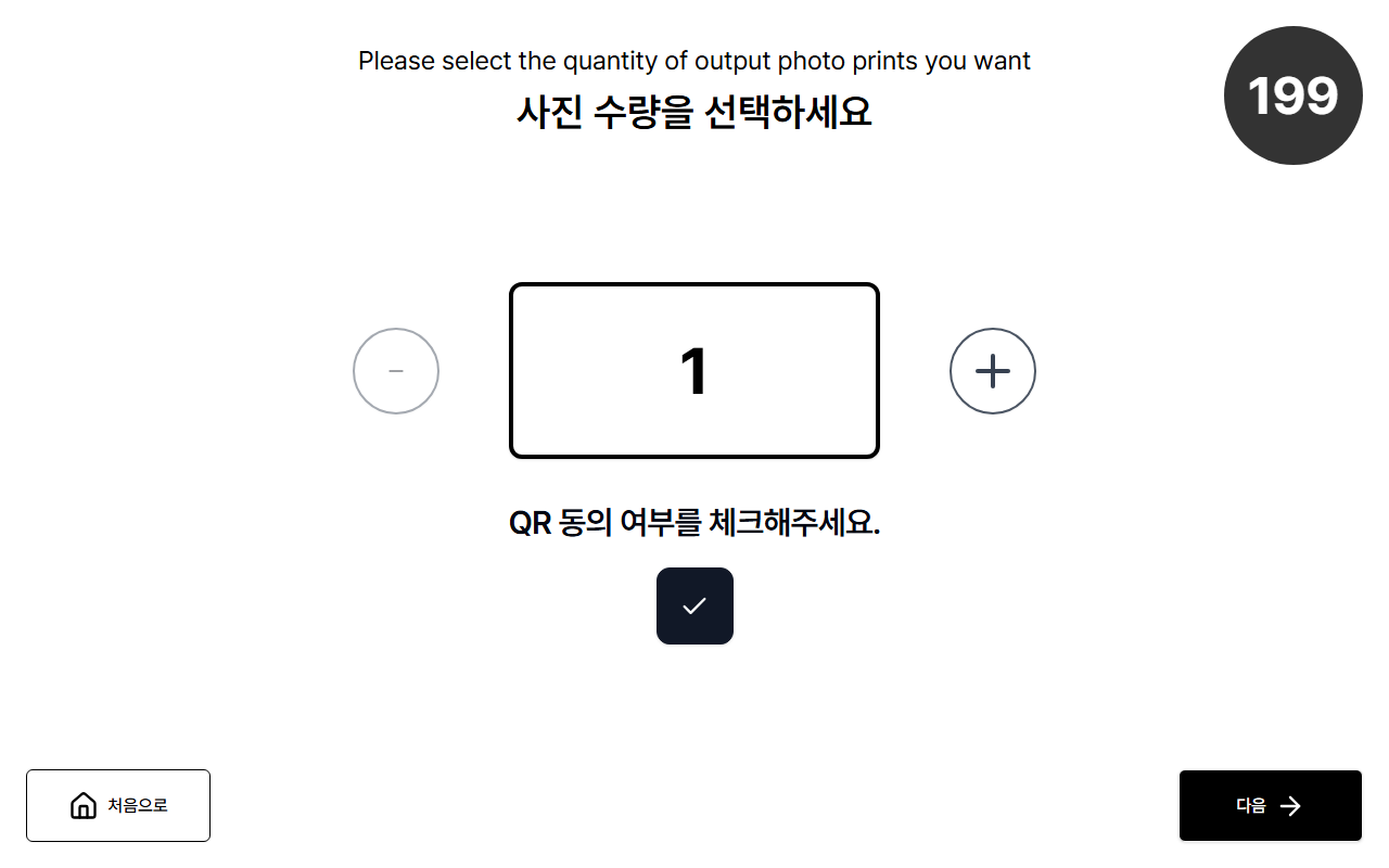 다음 버튼을 누르면 선택한 매수와 QR 동의 상태가 저장되고 다음 단계로 이동합니다.