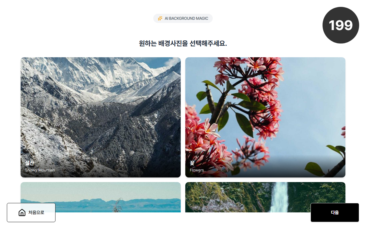 - 배경 선택 단계: "원하는 배경사진을 선택해주세요."라는 안내가 표시됩니다.